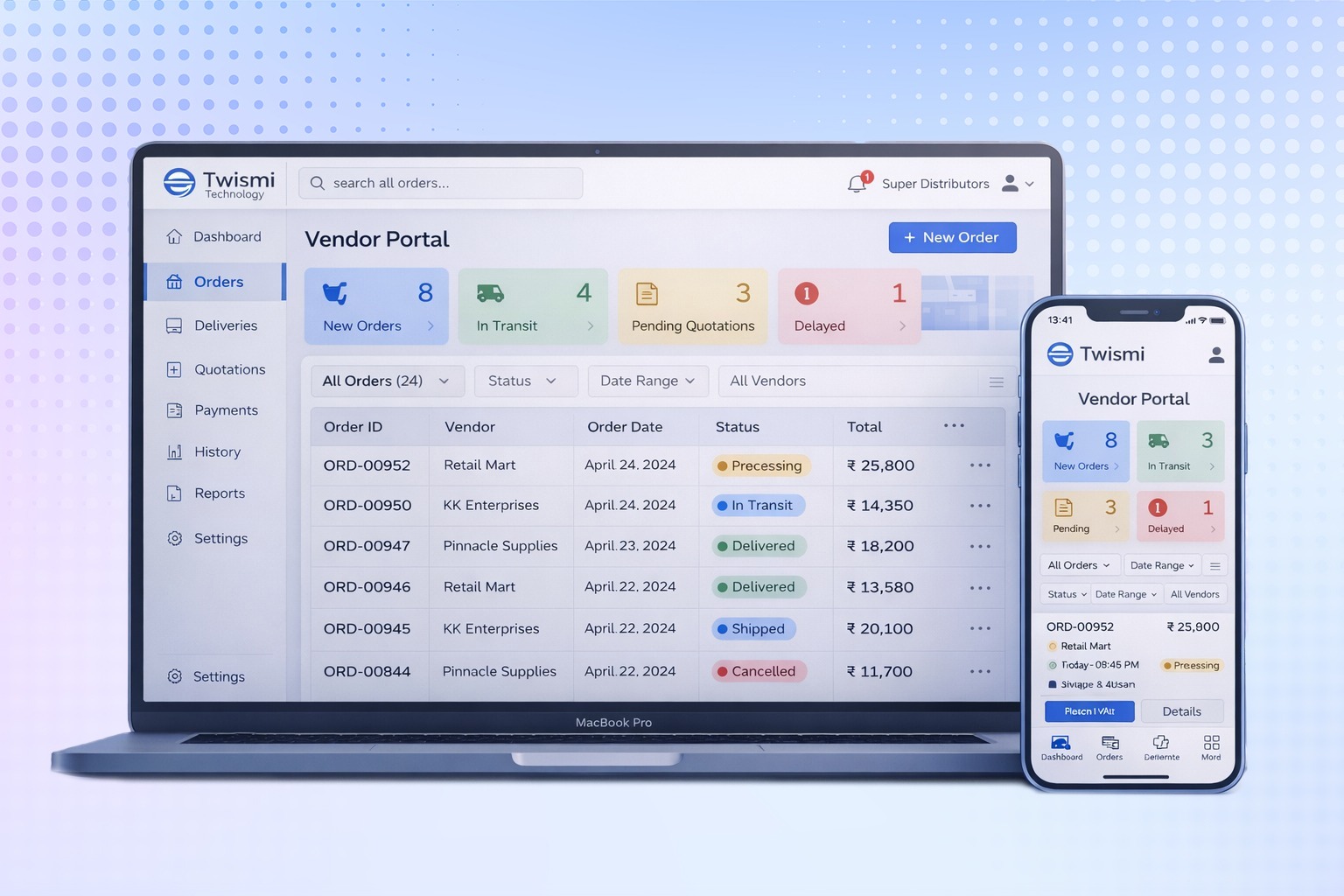 Vendors can securely log in to the application to place orders directly, view orders status, and track deliveries in real-time. The portal enables self-approval workflows, access to quotations, and complete order history without manual follow-ups.